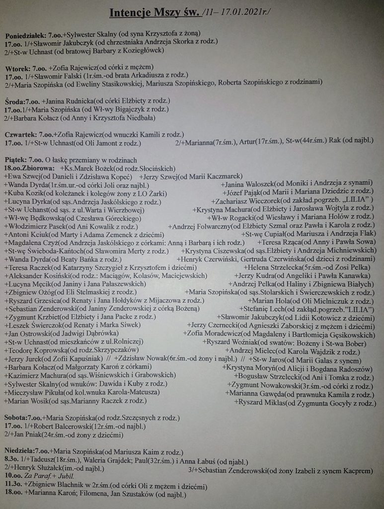 Intencje mszalne 11-17.01.2021 r.