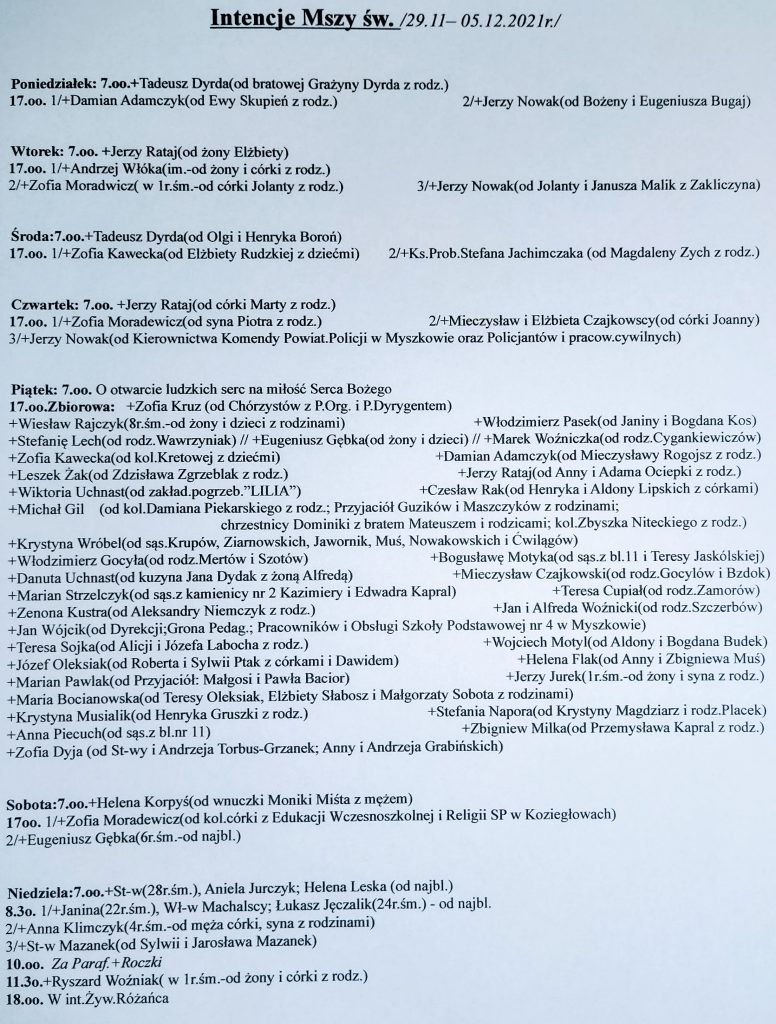 Intencje Mszy św. 29.11-5.12.2021 r.