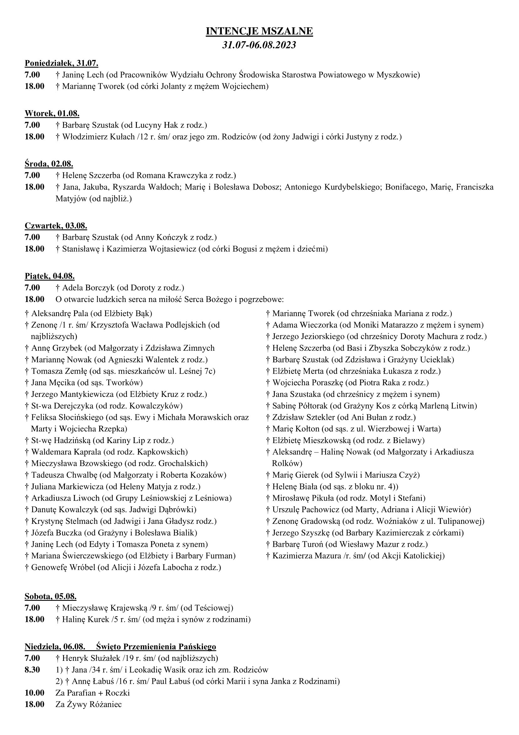 Intencje Mszy Św. /31.07-06.08.2023r./