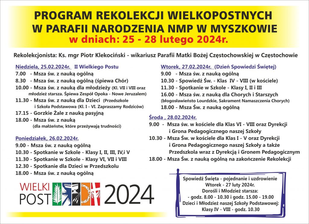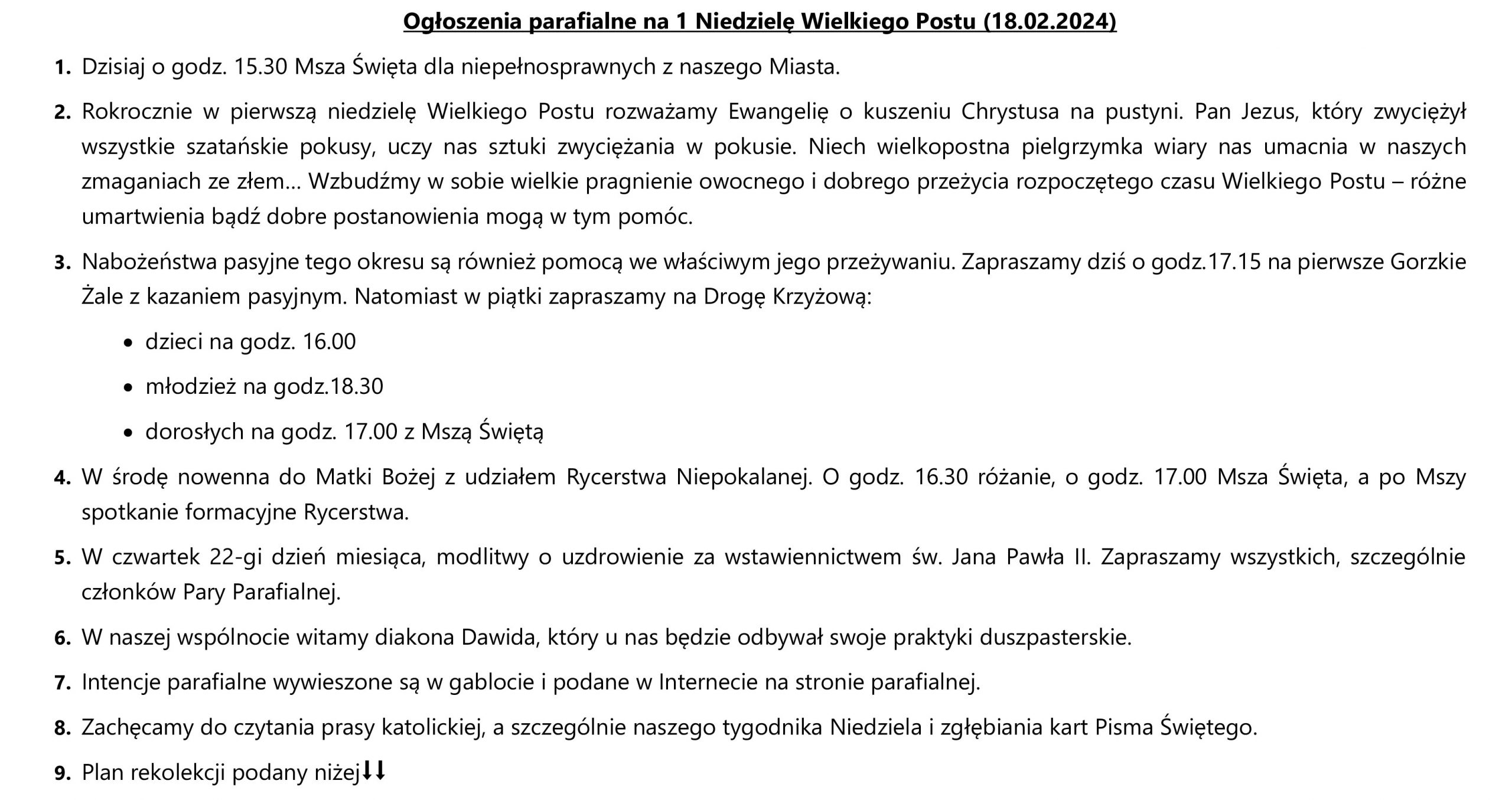 Ogłoszenia parafialne na 1 Niedzielę Wielkiego Postu (18.02.2024) i Plan Rekolekcji wielkopostnych (25-28.02.2024)