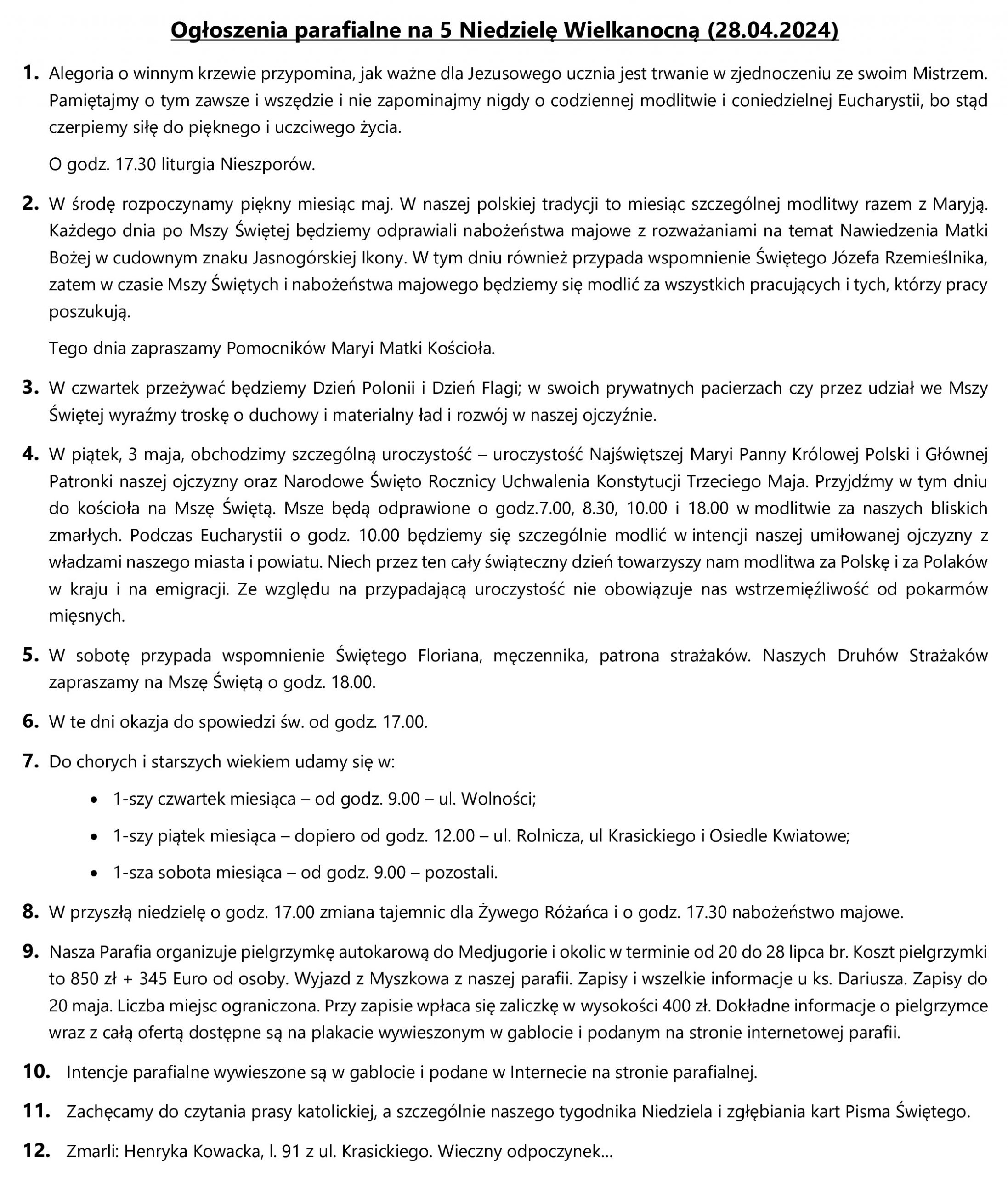 Ogłoszenia parafialne na 5 Niedzielę Wielkanocną (28.04.2024)