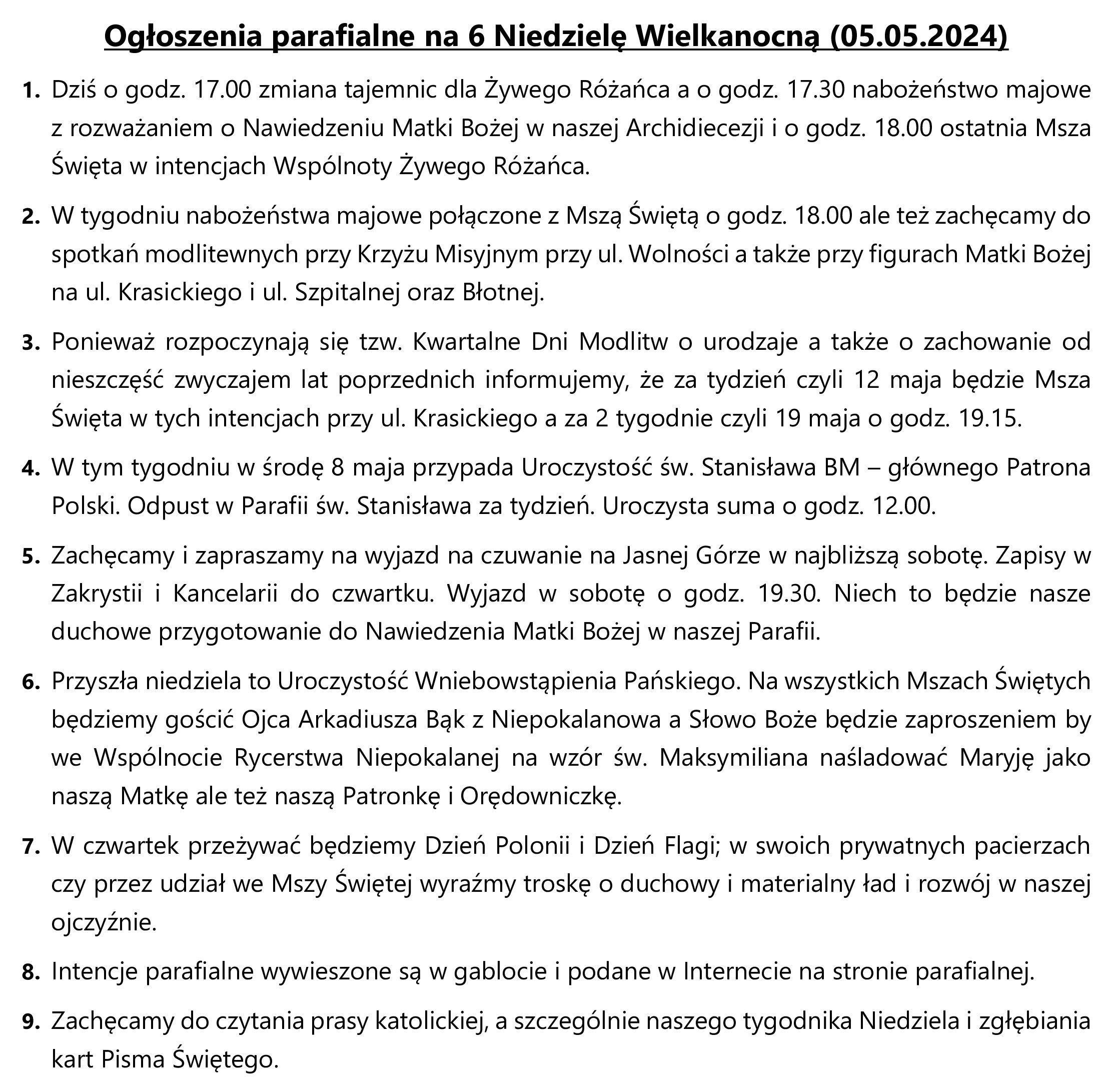 Ogłoszenia parafialne na 6 Niedzielę Wielkanocną (05.05.2024)