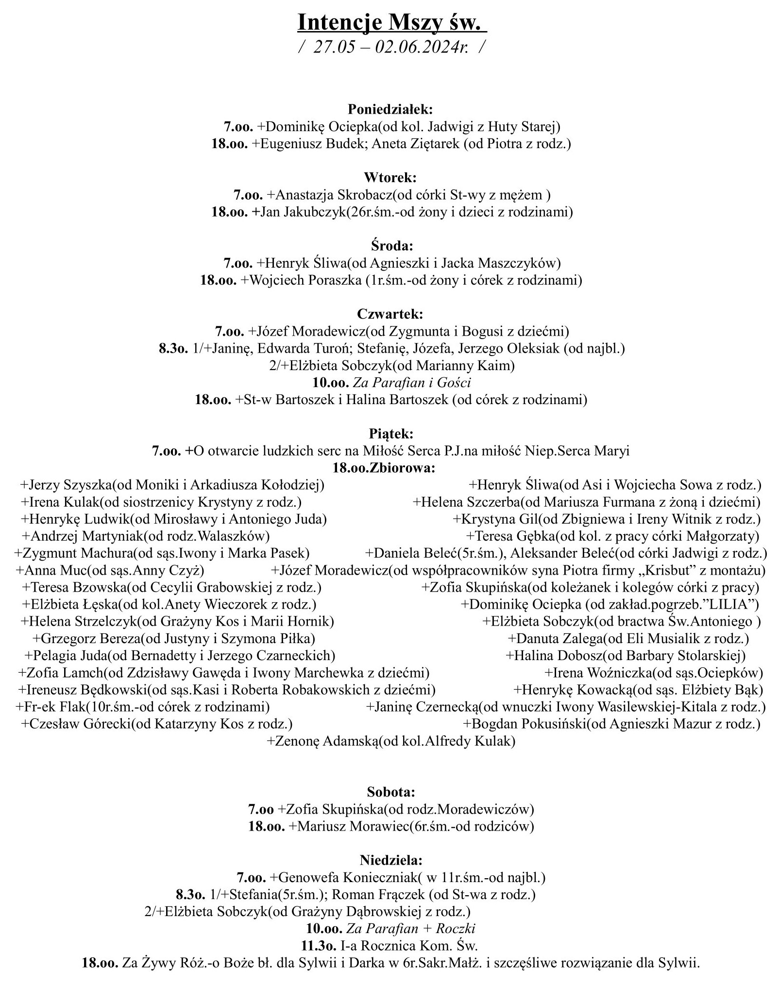 Intencje Mszy Św. /27.05-02.06.2024r./