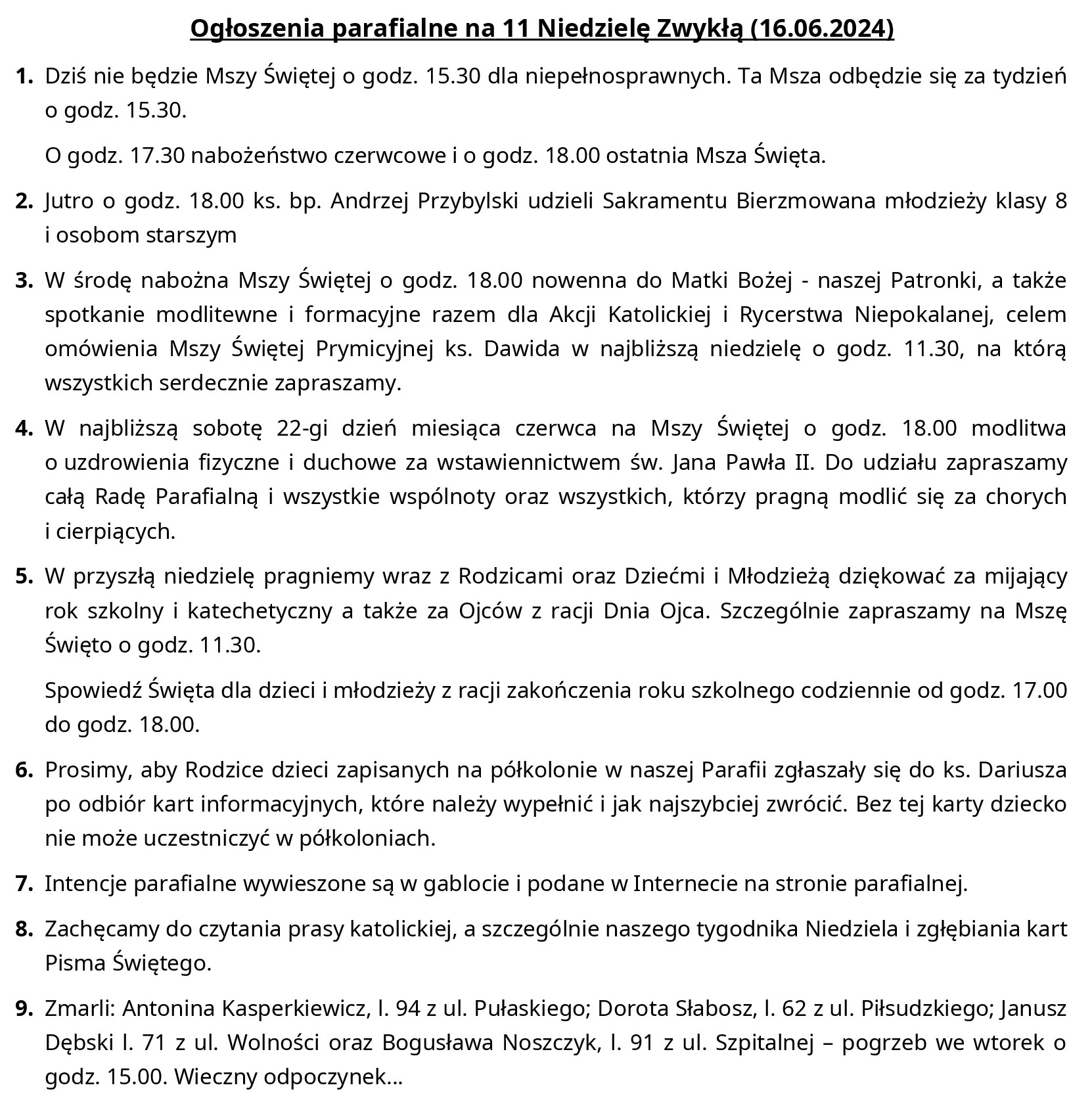 Ogłoszenia parafialne na 11 Niedzielę Zwykłą (16.06.2024)