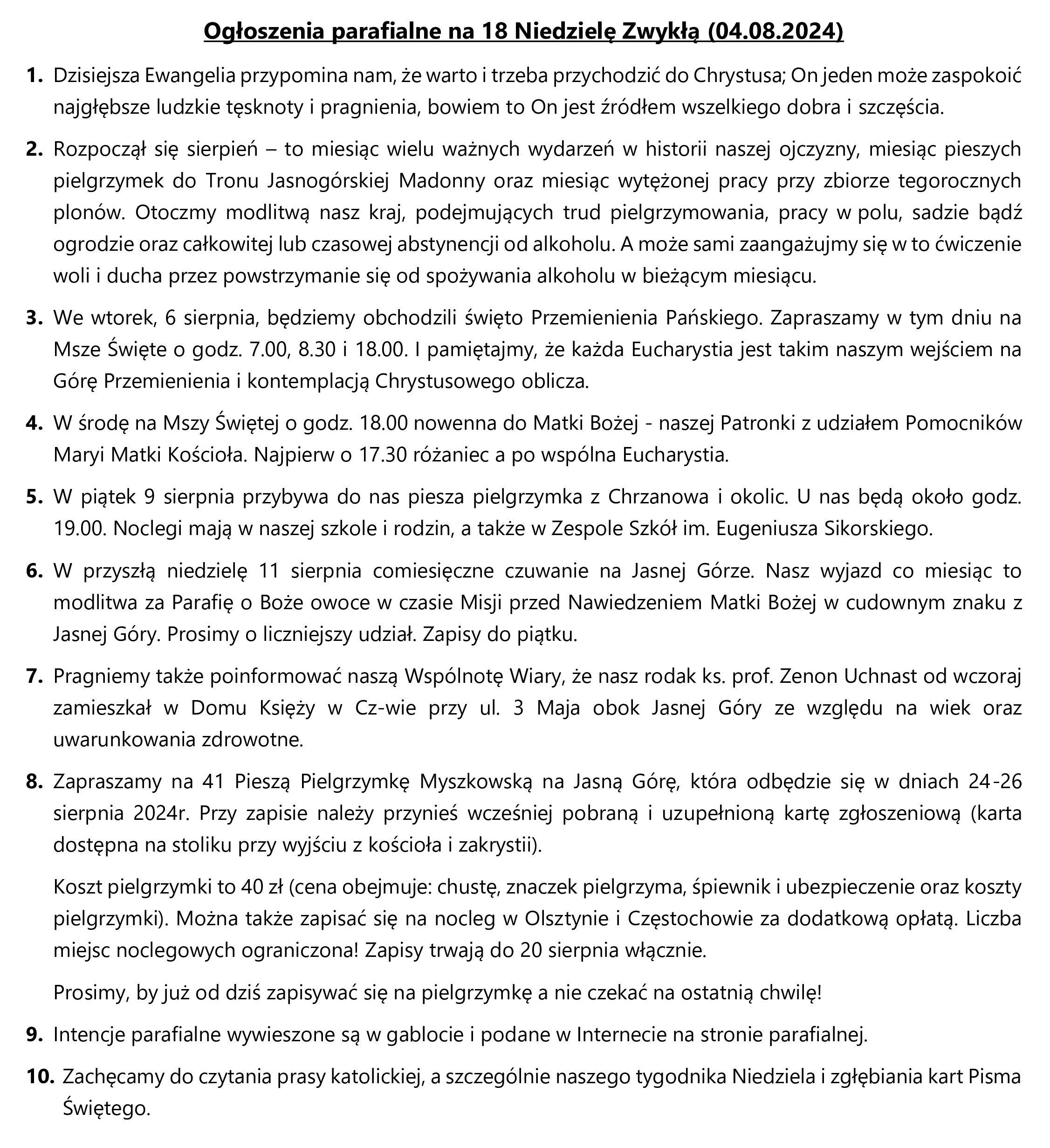 Ogłoszenia parafialne na 18 Niedzielę Zwykłą (04.08.2024)