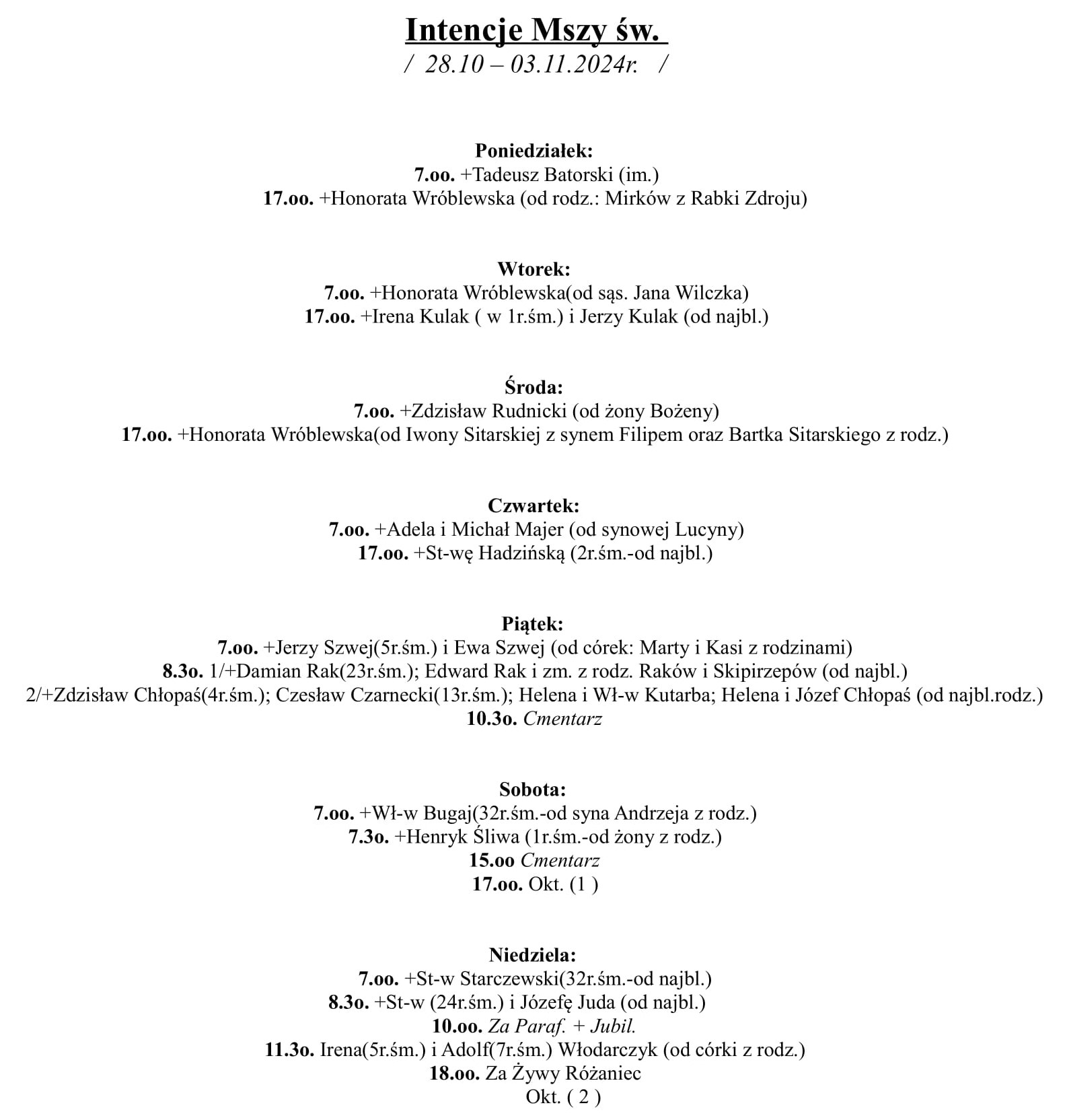Intencje Mszy św. (28.10-03.11.2024 r.)