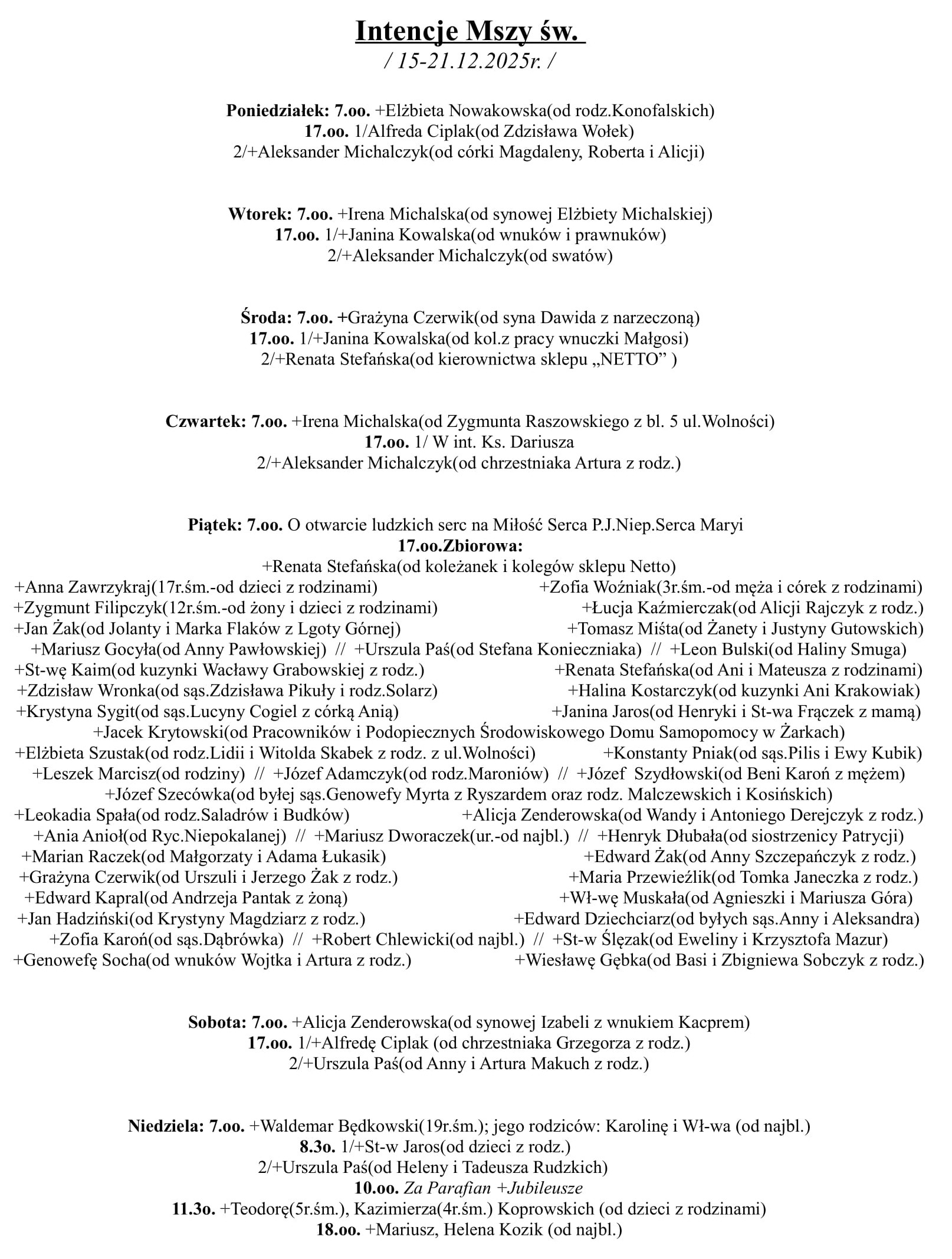 Intencje Mszy św. (15-21.12.2025 r.)
