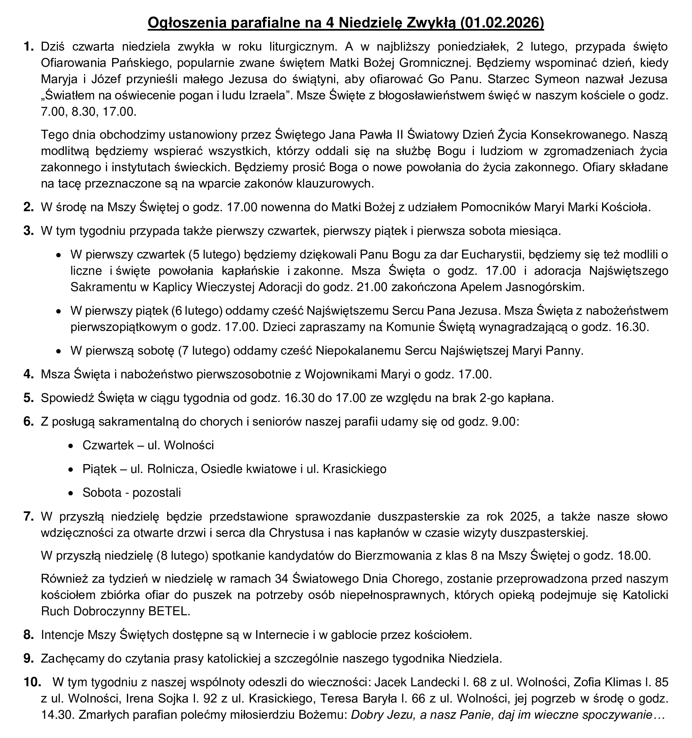 Ogłoszenia parafialne na 4 Niedzielę Zwykłą (01.02.2026)